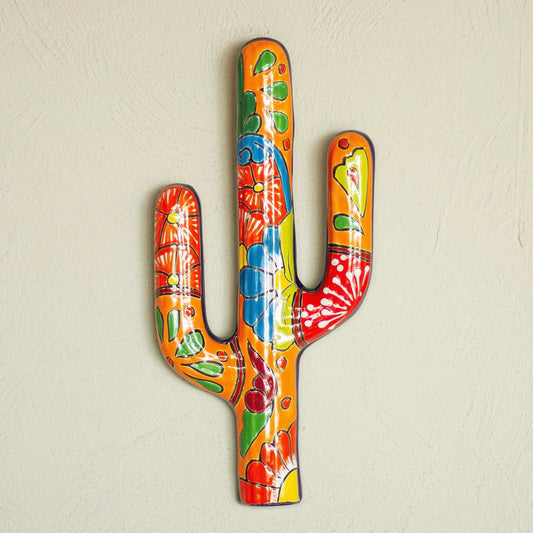 Talavera Saguaro - Floral Cactus Talavera-Style Ceramic Wall Sculpture